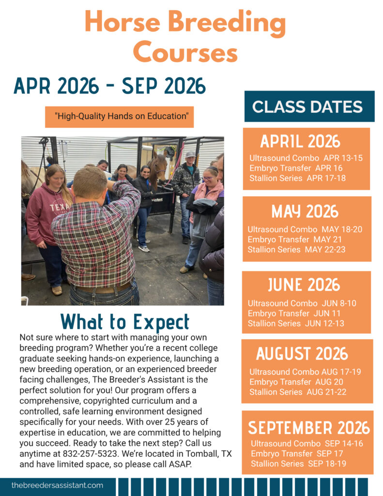 The Schedule for Equine Reproduction Courses are set for January – May 2026. Please feel free to call us for help.