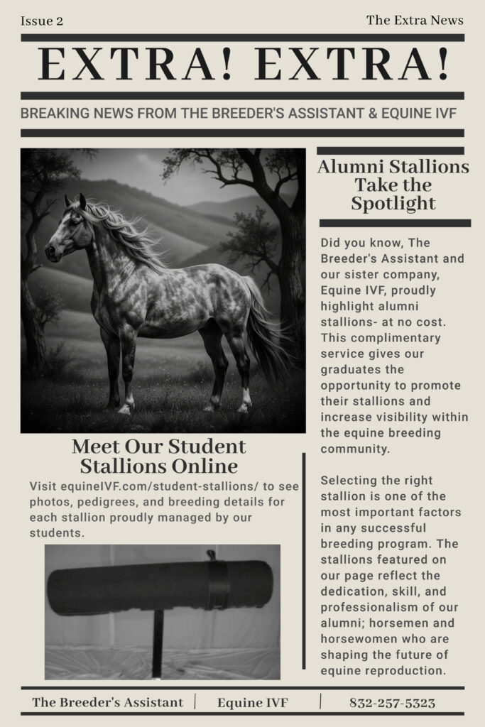 Our graduates aren’t just students- they’re breeders, innovators, and professionals standing remarkable stallions. Discover our Student Stallions, presented by The Breeder’s Assistant and our sister company, Equine IVF, and find your next perfect match for the upcoming breeding season.