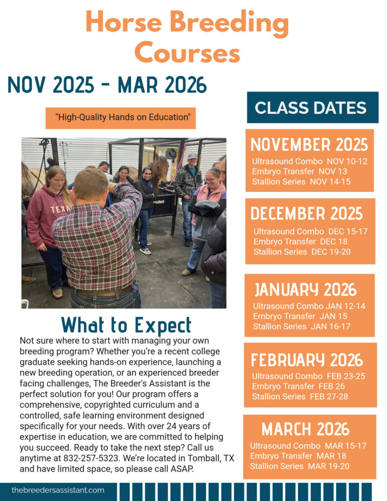 The Schedule for Equine Reproduction Courses are set for November – December 2025 and January – March 2026. Please feel free to call us for help.